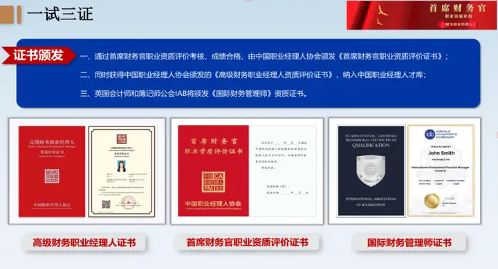 通过评价考试的学员,将对应获得由中国职业经理人协会颁发的初级(财务经理)、中级(财务总监)、高级(首席财务官)三个等级的财务职业经理人证书。这一证书是对学员在国内财务领域专业能力和职业素养的认可,有助于他们在国内企业中获得更好的职业发展机会。