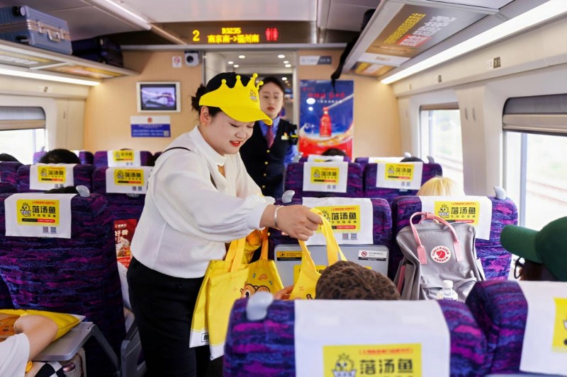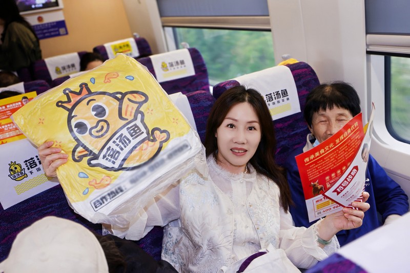 落汤鱼冠名的高铁专列,穿梭于长三角核心线路,覆盖上海、杭州、南京、深圳、宁波、厦门等超 20 座重点城市。从站台到车厢,落汤鱼的品牌元素随处可见,车身车贴、小桌板桌贴、头巾、车站LED大屏等多种媒体形式,精准触达商旅人群、家庭游客等核心消费群体,实现品牌立体高频次曝光的传播效果。落汤鱼在自身快速发展的同时,也在不断推动酸菜鱼行业升级创新,让更多的消费者了解酸菜鱼。
