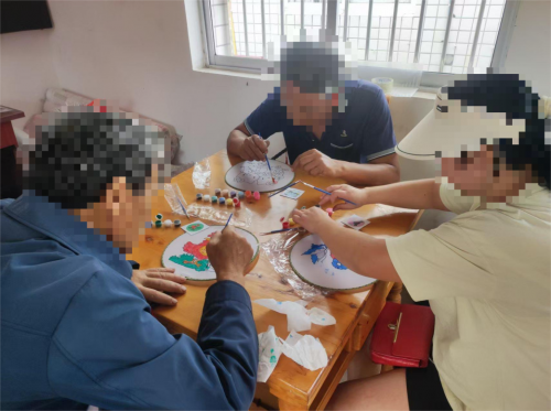 在社工的耐心教导下,大家纷纷拿起画笔,开始在扇子上尽情挥洒自己的创意。社工及志愿者穿梭在人群中,不时给予指导和鼓励。有的康复者画出了美丽的花朵;有的康复者画出了可爱的动物;还有的康复者用抽象的线条和色彩表达了自己内心的情感。在制作过程中,康复者们相互交流、相互帮助,现场气氛温馨而融洽。一位康复者兴奋地说:“我从来没想过自己还能画出这么好看的扇子,感觉特别有成就感!”大家沉浸在创作的喜悦中,原本空白的扇子逐渐变得五彩斑斓,每一把扇子都承载着患者们独特的情感和梦想。