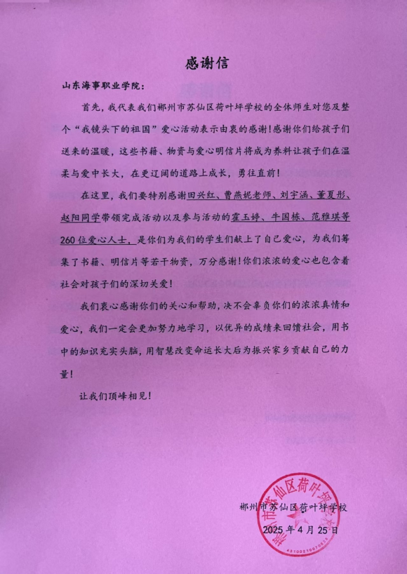 活动结束后,郴州市惠泽小学特意为学院及各位参与者发来感谢信,此次“我镜头下的祖国-乡村振兴,我为家乡代言”活动的成功举办,既为广大志愿者和爱心人士搭建了一个实现自我价值的优质平台,同时也为推进地方发展,响应乡村振兴战略提供了有益示范。让青春的力量与乡村的希望紧密相连,为这片广袤的土地带来更多的生机与改变。