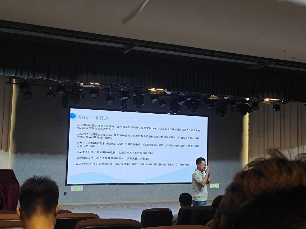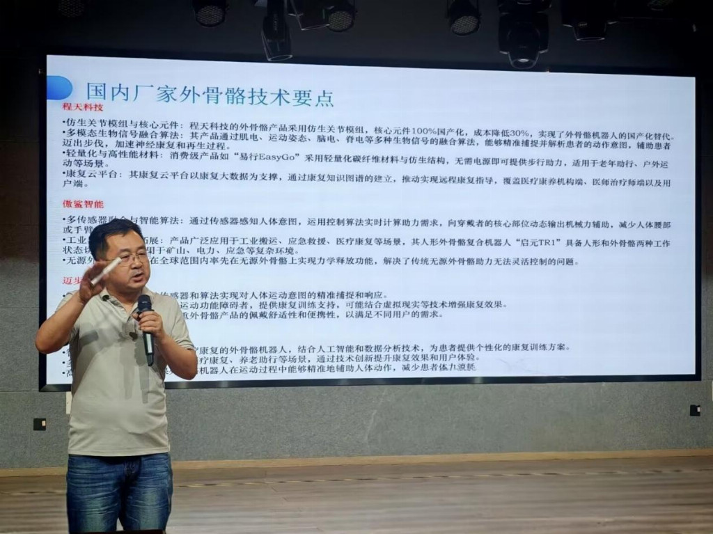 随后,杨教授将其团队研发的外骨骼产品与国外同类产品进行对比,向同学们展示:当前国内外骨科领域研究水平相当,国内更在诸多方面实现反超。他还剖析了国内外外骨骼企业的融资情况,清晰呈现出该产业的发展优势与广阔前景,以及优秀企业家的期待和国家的支持力度。作为朝阳产业,在外骨骼技术于国外尚未成熟之际,我国更应深耕细作,将前沿技术牢牢掌握在自己手中。