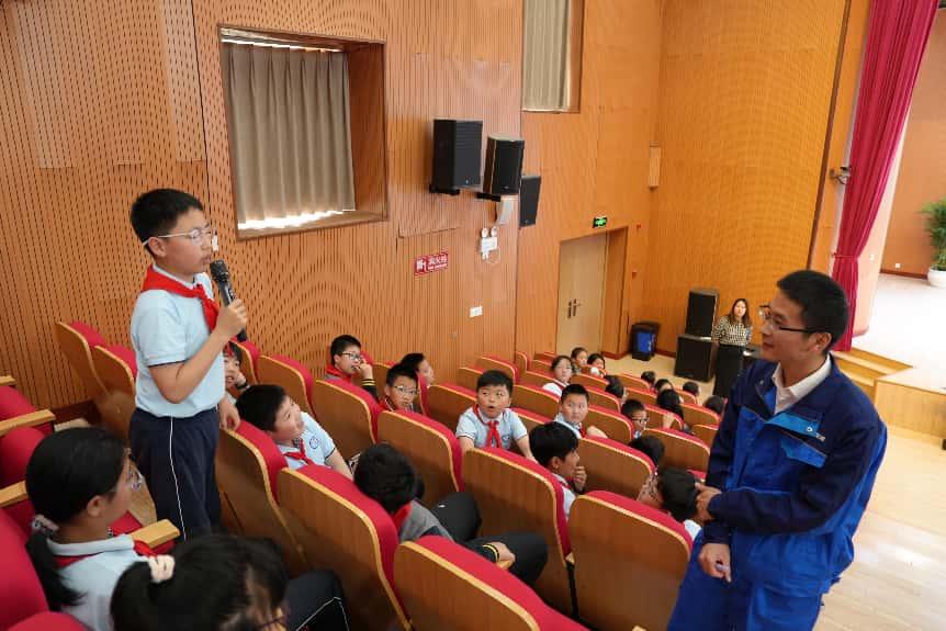 现场李森、赵灵远两位总经理部高级工程师用通俗易懂的语言为孩子们讲解风力发电的原理,以及港口形成所带来的货物运输便利。接着又已临港风电和洋山深水港建设为例,让学生们了解到港口建成的过程以及风电技术在近些年不断进步的过程。为了让学生们有更直观的感受,两位工程师们还特意准备了风电设备模型,用最直观的方式让孩子们知道了风力发电机将风能转化为机械能最终再转化为电能的过程。同时,介绍了目前正在建设的小洋山北侧西防波堤项目正在使用的桶式基础结构。