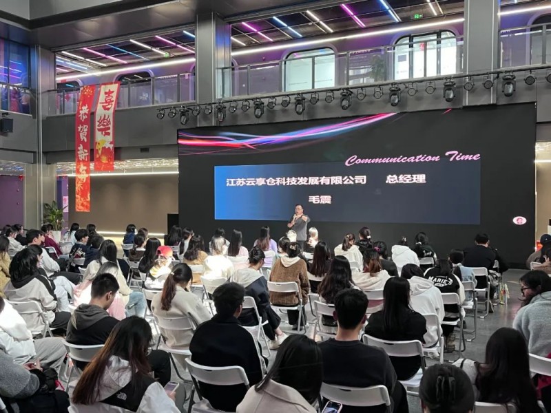 此次分享会特别邀请到了江苏云享仓总经理毛震,他以独特且生动的方式开启了同学们对未来职业发展的思考之旅。毛总开场便带来一个充满趣味的小游戏,他向同学们提问:“自己十秒钟能拍多少下手掌?” 同学们纷纷踊跃作答,答案从较为保守的 20 下到充满自信的 60 下不等。这看似简单的小游戏,实则蕴含深意,旨在让同学们意识到,人的潜力往往超乎自己的想象,在未来的职场和生活中,不要轻易给自己设限。他结合自身的创业历程和行业发展趋势,为大学生们剖析了当下市场环境对人才的需求特点,分享了宝贵的职场经验与心得,鼓励大学生们在校期间注重实践能力的培养,提升综合素质,以更好地适应未来职场的挑战。