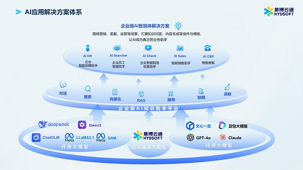 “慧博云通企业级AI知识助手”是慧博云通基于大模型技术打造的企业级智能解决方案。方案围绕营销、客服、运营等核心场景,构建了涵盖知识问答、内容生成、智能检索等功能的企业级AI智能体,可定制化开发企业知识助手、对话式BI数据助手、智能HR助手、高拟人化AI客服等应用,旨在通过生成式AI技术提升企业信息组织与知识获取效率,帮助企业破解业务经验难沉淀、知识更新滞后、信息分散等痛点,实现降本增效与智能化升级。