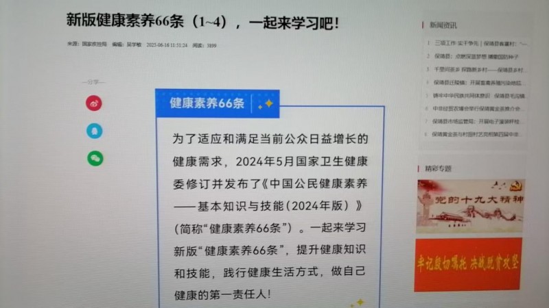 2025年6月是第二个全民健康素养宣传月活动,主题为“提素养 促健康”,旨在倡导健康生活方式,当好自己健康的第一责任人,提升全民健康素养。国家卫生健康委发布《关于开展2025年全民健康素养宣传月活动的通知》以来,该县卫健局和各级医疗卫生机构(含村卫生院)和医务人员积极围绕2025年卫生健康系统为民服务实事项目、全民健康素养提升三年行动和健康体重管理行动等核心内容,纷纷通过微信群、朋友圈、公众号、视频号、微博、抖音、电子显示屏等新媒体平台重点推送2024版《中国公民健康素养66条》,帮助公众掌握健康知识和技能,养成健康生活方式,当好自己健康的第一责任人,提升全民健康素养水平。初略统计,截至目前,全县阅读观看群众近5万人次。