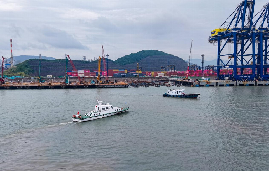 一阶段进行的是钢平台坍塌预警响应演练:沉降位移自动观测系统发出红色预警后,应急领导小组立即响应,复核钢平台沉降位移情况,并通过一键喊话系统组织人员撤离,同步调动无人机、无人船侦察水域情况,联络大榭海事处实施通航管制。最终在钢平台坍塌前完成整个预警响应流程,未造成严重后果。
