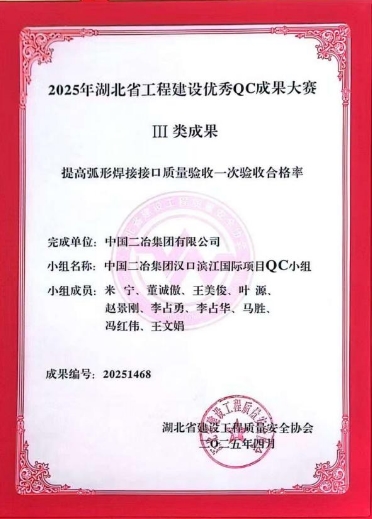 近日,2025年湖北省工程建设优秀QC成果交流发布会在荆州市召开。中原公司汉口滨江国际项目QC小组申报的《提高弧形焊接接口质量验收一次验收合格率》成果凭借突出的创新性和实践价值,荣获Ⅲ类奖项。