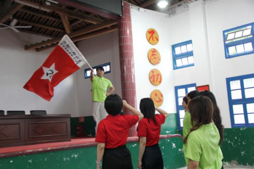 活动首站,实践队队员们来到蓬华革命历史展示馆。步入馆内,多件革命文物错落陈列,泛黄的家书字迹斑驳,锈迹斑斑的武器,诉说着曾经战场上的激烈厮杀。实践队成员们围聚在讲解员身旁,屏息凝神,深刻体会到革命先辈们坚定的信仰与无畏的牺牲精神。在郭总的带领下,全体实践队成员高举右拳,庄严宣誓,铿锵有力的誓言在展示馆内久久回荡。