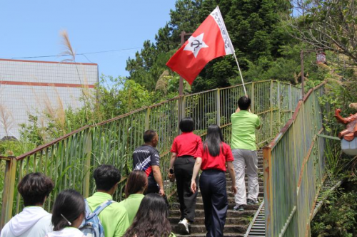 离开展示馆,众人来到百级长阶之下。石阶笔直向上,在阳光的照耀下泛着古朴的光泽。实践队成员们怀着无比崇敬的心情,踏上攀登之路,步伐坚定,一步一个脚印,向着顶端迈进。每一步台阶,都是对革命先烈的缅怀;每一次攀登,都是对红色精神的传承。