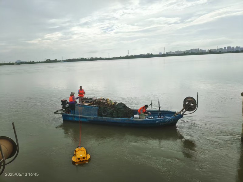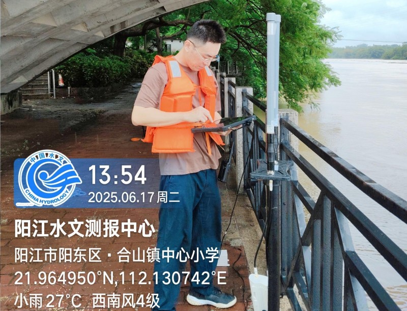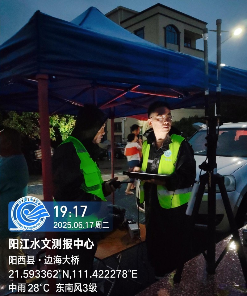 闻“汛”即动,向险而行:他迅速组织测报中心青年突击队力量,顶风冒雨奔赴辖区关键水文监测断面。采用现代化监测设备(走航式ADCP、AiFlow视频测流系统)在阳西县边海陂断面、阳东区合山站等地开展应急监测,确保了关键水文数据在极端条件下的连续、精准、高效获取。17日晚上在阳西县边海陂断面监测过程中,雨一直在下,水位持续上涨,边海大桥两端路面快速上水,当地村镇干部、公安民警都在快速疏散居民。邹宇一行同村镇干部沟通交流后,当地民警快速疏散出一条通道给邹宇一行开展监测。他们熟练快速地安装调试应急监测设备,将搭载走航式ADCP的无人船连接牢固后放入河中,随着河流上漂浮物越来越多,施测队员分工明确,有人观测上下游河面情况、有人在桥上紧紧拖着无人船匀速前进,雨也打湿了邹宇的眼镜、平板电脑和记录本。“阳西边海陂断面19时25分水位4.95米,实测流速1.31米/秒,实测流量1200立方米/秒”,他们实测的准确数据当场报送,为水情预报预警提供了准确的数据支撑。