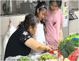 知识武装头脑,实践检验真知。怀揣着满满的“理论储备”和跃跃欲试的兴奋,小朋友们在队员的陪伴下,信心十足地“进驻”兰园菜市场的体验摊位。“小小摊主”初露锋芒:孩子们迅速进入角色,将课堂所学转化为实际行动。整理摊位,保持整洁;主动向摊主请教台秤使用;牢记菜价,用稚嫩而清晰的声音热情招呼过往居民:“阿姨好,看看我们的新鲜蔬菜呀!”面对顾客询价,自信应答;从拿菜、称重、报价到装袋,一套流程虽显稚嫩却日渐从容。