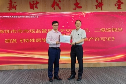在热烈的掌声中,深圳市市场监督管理局机关党委书记、二级巡视员陈建民同志向时代特医颁发深圳市首张特医食品生产许可证。该许可证不仅是对时代特医工作的高度认可,更体现了深圳市市场监管局对特医食品产业发展的有力推动。