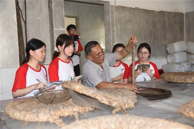 近日,吉首大学“文传青年”社会实践团走进吉首市河溪镇,探寻非遗“河溪香醋王”的酿造奥秘。实践团走进非遗传承人杨德亮家中,与杨德亮进行了一场面对面采访。自1974年接过父辈醋坊,杨德亮用四十年将"河溪赤醋"打造成远近闻名的"河溪香醋王",用红砂岩渗水与自然制曲的古法工艺,守护着湘西人舌尖上的文化根脉。