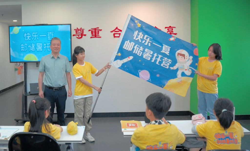 开营现场暖意融融,欢声笑语此起彼伏,福州市总工会、福州市商贸工会领导亲临见证,与孩子们共同感受这份成长的期待。邮储银行福州市分行工会谢宇主席将印有暑托班专属标识的旗帜授予学员代表,随后,学员代表庄严宣誓,“遵守纪律,团结友爱,探索新知,快乐成长”的稚嫩誓言响彻现场。