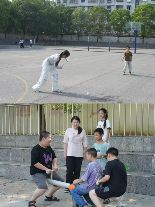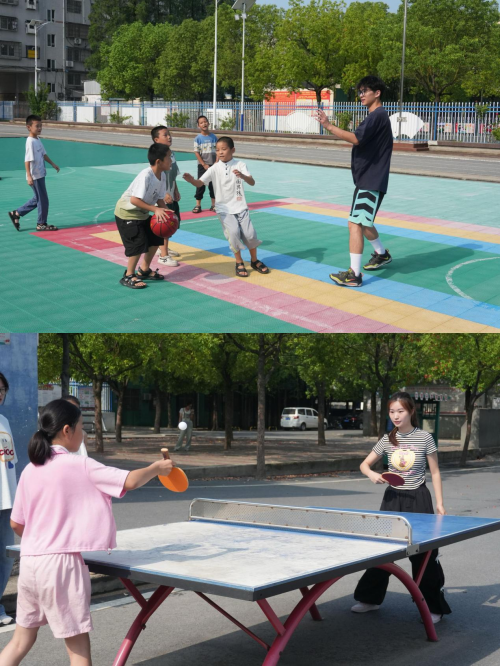 分组活动时,操场成了多元的运动舞台。篮球场上,学生们灵活穿梭,志愿队员或组织攻防练习,或参与对抗,与学生一起体验团队协作的乐趣;羽毛球场地,彩色羽球在空中飞舞,志愿者一边指导动作,一边接受学生挑战,师生在互动中分享运动的快乐;乒乓球台前,银球在球网两侧快速往来,志愿队员作为陪练与学生切磋,击球声和欢笑声不断。这些长期陪伴学生的运动器械,虽有磨损,却体现出乡村少年对体育运动的热爱。