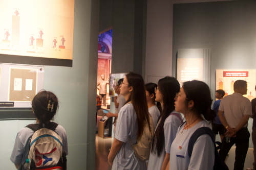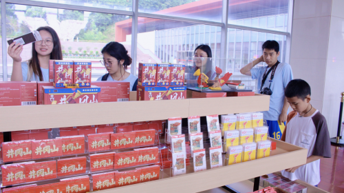 在博物馆文创展区,队员们细致观摩产品设计:观察红色符号如何从文物中提炼,探究其与现代设计语言、实用功能及生活美学相融合的智慧。通过分析材质选择、叙事手法与市场共鸣点,团队思考如何将“让历史可亲、可感、可带走”的转化逻辑,融入“红韵绘农”品牌塑造与农产品设计,为乡村振兴拓宽创新路径。