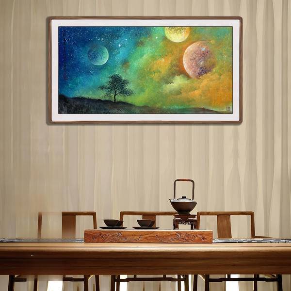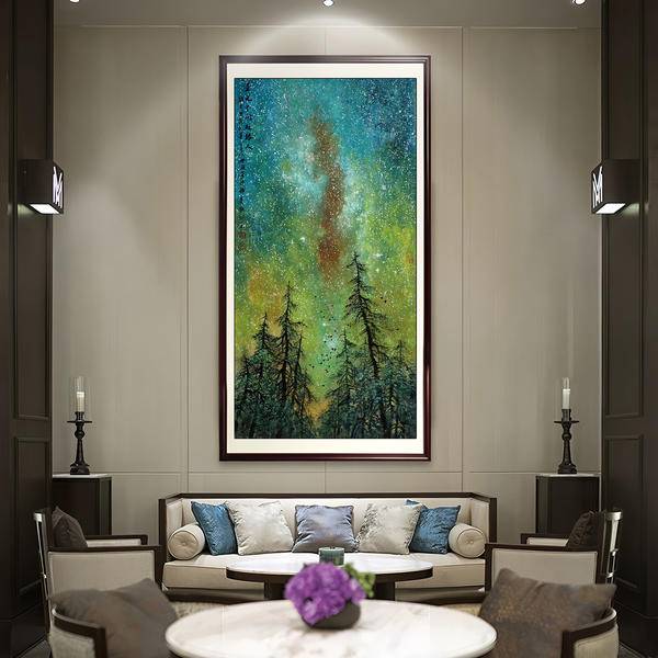 而在国画领域,黄建南将这份对浩瀚星空的探索与精神传递给了罗科通。作为黄建南的亲传弟子,罗科通并未仅仅是继承,而是创新。他在传统水墨与现代色彩之间搭起桥梁,用没骨禅意画、幻墨幻彩技法,将星空搬进国画的世界里,造就了独属于东方审美的星空意境。
