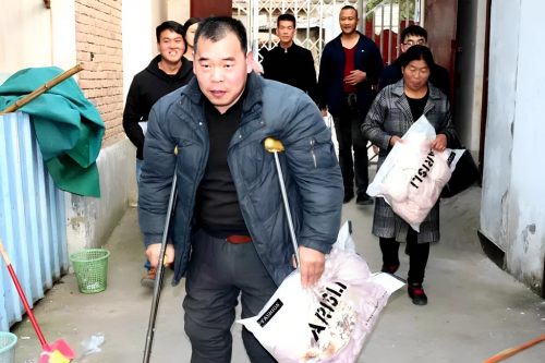 “妹子,咱不哭。”李文金的声音从门口传来,他拄着双拐,身后跟着扛米面油的志愿者。他把2000元现金塞进梁连英手里,又蹲下来摸孩子们的头:“娃们,明天就回学校,学费叔叔们想办法。”