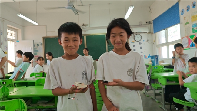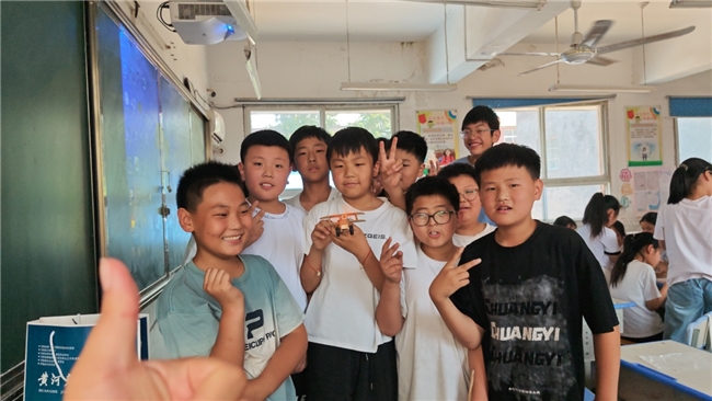 经过一段时间的动手实践,同学们带着自己亲手制作的作品来到成果展示环节。各小组选派代表上台展示实验成果,并分享学习心得和实验过程中的趣事。最后,部分班级学生与大学生志愿者一起合影留念,记录下这难忘的时刻。