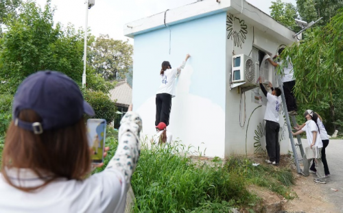 墙面清理完毕后,实践团正式进入墙体美化的核心阶段——初步绘制墙面线稿。在绘制过程中,大家或蹲或站,或俯或仰,全神贯注地勾勒着线条,力求每一个细节都能精准到位。颜料在画笔的舞动下,逐渐在墙面上铺展开来,一幅幅生动形象的画面逐渐显现。村民们也纷纷围观,对实践团的工作表示出极大的兴趣与赞赏,不时传来阵阵掌声与欢笑声,让整个周一村充满了温馨与和谐。