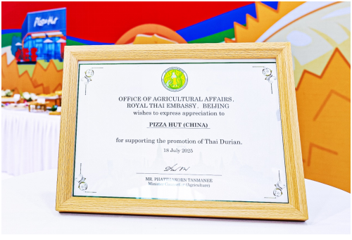 活动现场,周伟弘先生代表泰国驻华大使馆农业事务处为必胜客颁发荣誉证书,以表彰其在泰国榴莲推广中给予的大力支持,以及在中泰餐饮价值链协同发展中的标杆贡献。