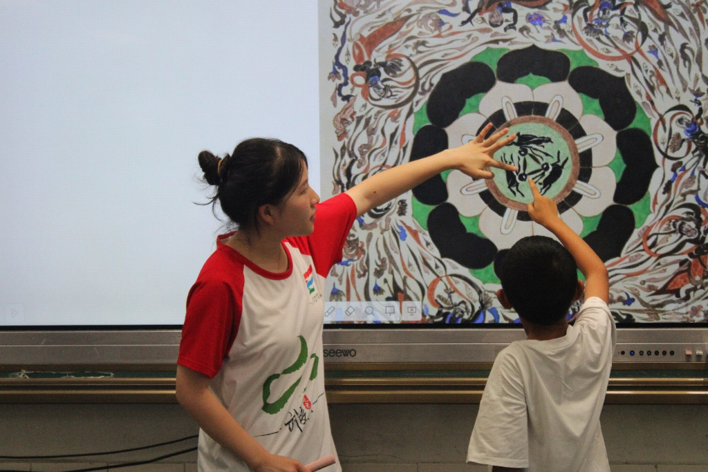 图为志愿者周芬芳带领学生探究敦煌藻井中的奥秘 雷欣怡 摄