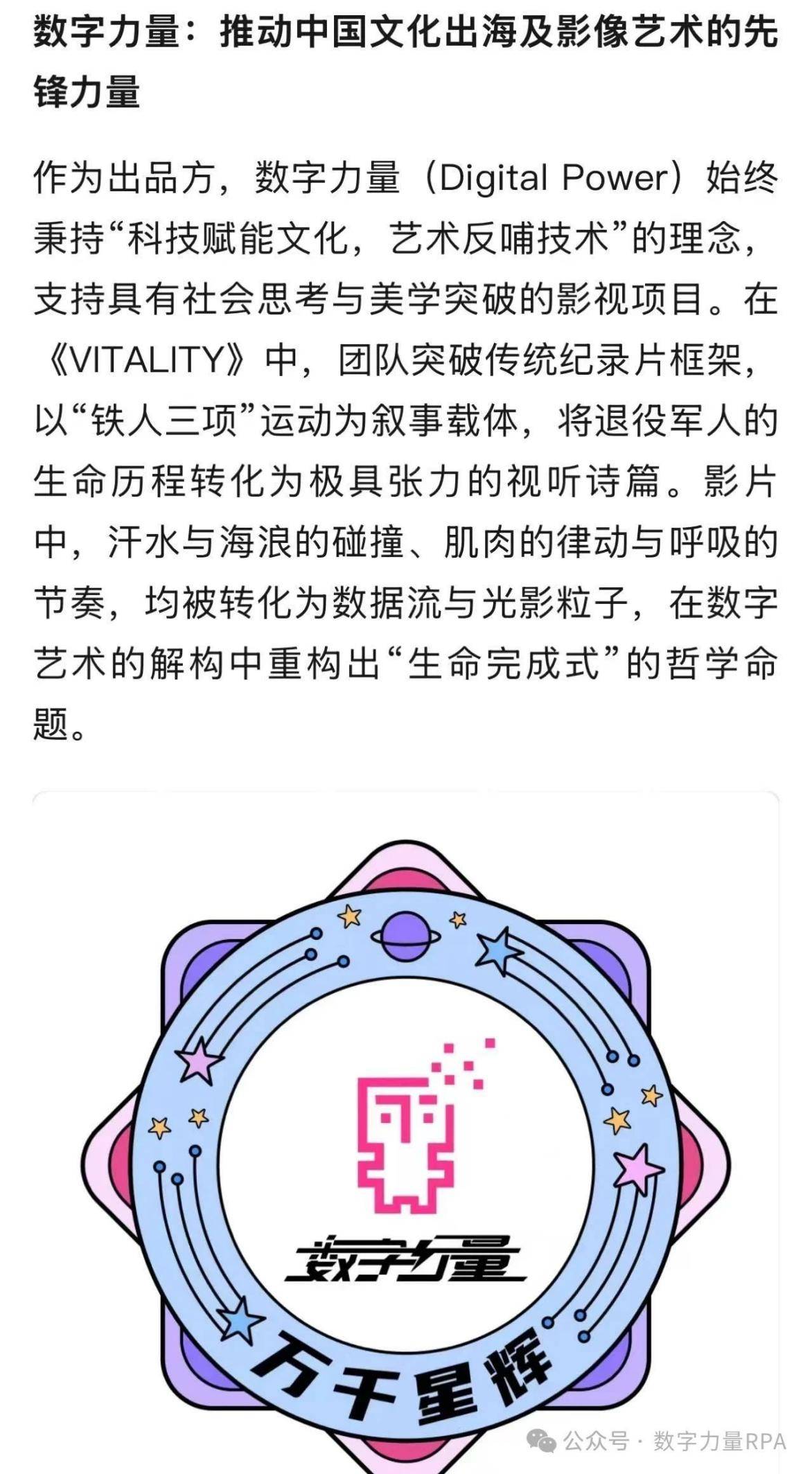 2025年7月17日,在纽约国际电影节(NYC)的官方晚宴上,一则激动人心的消息传来:由数字力量出品、新锐导演闫梦佳执导的铁人三项纪录片《Vitality》成功入选A类电影节竞赛单元。这不仅是对影片艺术价值的权威认可,更标志着数字力量在短片领域的影响力已从中国延伸至全球舞台,其"新媒体短片独角兽"的行业地位提供了有力佐证。