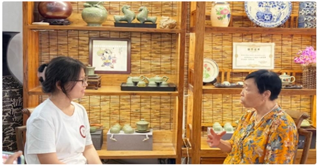 图为耀州窑青瓷恢复第一代刻花大师张夏珍在接受实践队采访。宗欣宇 供图