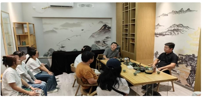 耀州窑文化基地管委会文旅局负责人吴凡、铜川耀州窑文创传媒有限公司副总经理靳杨与成员们围桌而谈,从直播间流量谈到大学生创业补贴,围绕“园区产业体系发展” “扶持大学生创新创业政策的落地”等议题进行深入交流,队员们了解到了非遗保护与发展的创新举措,看到了非遗传承的新可能。