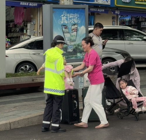 这支16人队伍经过两个月封闭训练,如今专职守护老虎石景区交通,每天15小时勤务。数据显示,截至7月15日,她们已疏导车辆9万余辆,清理违停200余次。令人动容的是,在完成刚性执法之余,姑娘们还化身"景区保姆"——抬轮椅、找失物、扶老人,甚至帮游客搬运童车上下百余级台阶,千余次温情服务让游客直呼“像自家闺女”。