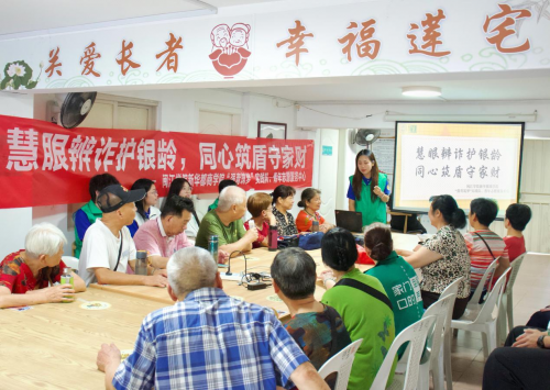 7月2日上午,实践队携手邻里汇社区,开展“慧眼辨诈护银龄,同心筑盾守家财” 金盾护航系列防诈宣传活动,以非遗文化为载体,创新防诈教育形式。活动中,实践队员以非遗皮影戏为媒介,演绎“唐僧师徒遇理财骗局”故事,将“保本高息”等诈骗话术融入经典情节,让老人在感受传统艺术魅力的同时识破诈骗套路。实践队通过“情景模拟+案例分析”的形式,生动还原“虚假理财”“冒充亲人”六大典型诈骗场景,引导老人参与互动讨论,掌握“核实身份”“多方求证”等防诈技巧。在知识学习后,设置 “防诈知识大闯关”有奖问答环节,以印有新华都商学院防诈吉祥物和反诈标语的鸡蛋为奖品,激发兴趣,强化老人防诈记忆。在最后的非遗竹编画制作环节,队员采用“一对二” 指导模式,带领老人制作含防诈元素的手工艺品,让反诈理念与传统工艺深度融合。