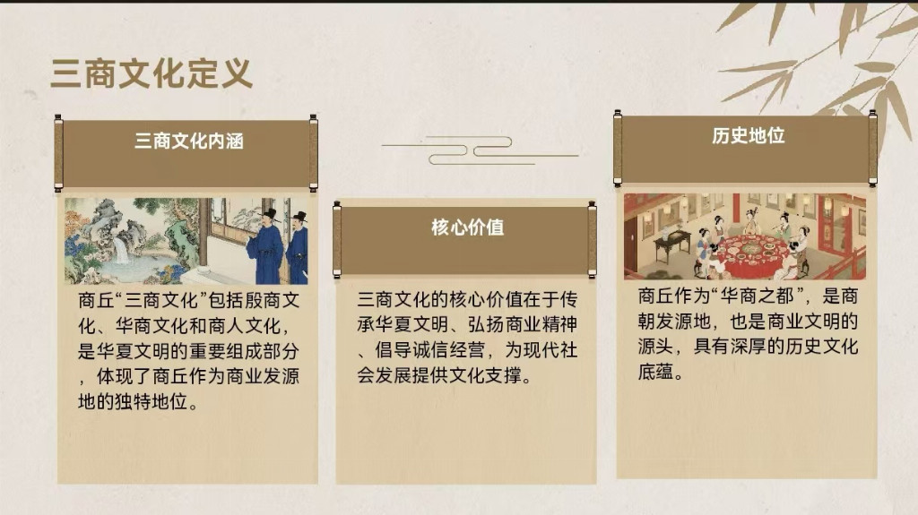 “三商文化”涵盖殷商、华商、商人文化,是华夏文明重要部分。成员们向同学们娓娓道来:“华商始祖王亥驾牛车开启商贸,甲骨文、青铜器藏着先民智慧。现在古城文旅、产业园里,还能找到诚信经营、开拓创新的老规矩。这些都是我们该懂的文化底气!”在对三商文化的学习中,同学们渐渐领悟到了三商文明密码。