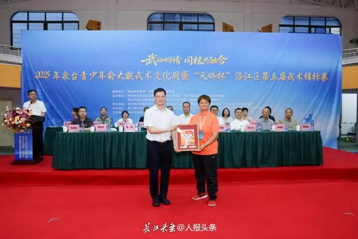 泉州南少林实验学校校长陈翔与台中市大肚区体育会跆拳道委员会领队刘琼芳互赠纪念品,象征着海峡两岸血脉相连的深厚情谊。刘琼芳表示,时隔一年再访泉州,武魂浸润的大美洛江与南少林的拳风剑影令人神往,这份跨越海峡的缘分让两岸同胞心手相牵。