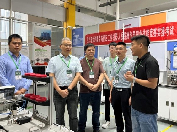 工作人员在赛前认真布置竞赛现场,准备物料,一丝不苟完成赛前准备。来宾、专家一行现场观摩比赛情况,工匠学院培训负责人还就智能制造领域工业机器人操作岗位人才需求、应用场景以及赛项考核要点作了介绍。