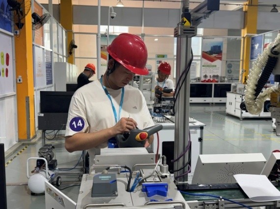 选手们专注地站在操作台前,眼神紧盯着机械臂的每一个动作。有人快速在控制柜的操作面板上输入指令,调整运行参数;有人俯身观察工件的定位精度,用卡尺测量细节尺寸;还有人偶尔停下,眉头微蹙,对着流程图大脑快速运转思索下一步操作。