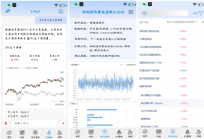 平台的 “智慧” 不仅体现在技术层面,更在于对用户需求的深度洞察。其 UI 界面设计兼顾专业性与易用性,既展示大盘指数、板块动态等宏观数据,也支持个股精细化分析(如贵州茅台的实时行情、历史波动率等)。用户只需输入自然语言指令(如 “分析某股票近一年走势”),系统便会自动生成包含 KDJ 金叉信号、资金流向等指标的可视化报告,让复杂的量化分析变得 “一目了然”。