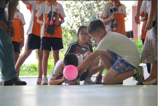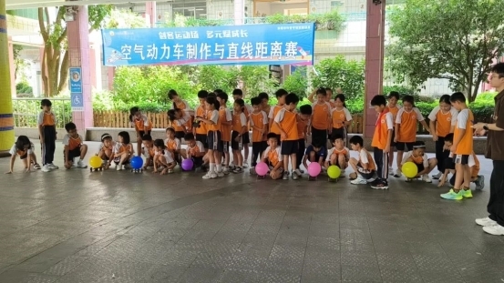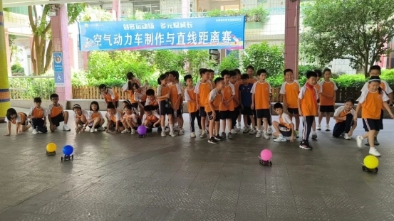 三年级的“赛车手”们拿到材料后,迅速投入到空气动力车的制作中。比赛开始,“赛车手”将自己制作的小车放置在起跑线上,双手紧紧握住气泵,随着裁判一声令下,他们迅速放开吸管,空气瞬间从车身后的气球里涌出来,推动着小车如离弦之箭般向