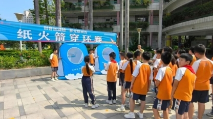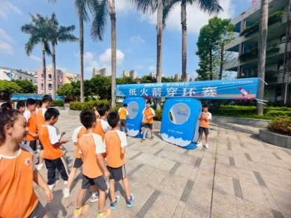 四年级的选手们持亲手制作的纸火箭,满怀期待地站在发射线后。随着裁判一声令下,选手们纷纷用力一吹手中的发射器,空气瞬间被压缩,强大的气流推动纸火箭呼啸而出。它们如一道道白色的闪电,直冲着远处悬挂的圆环奔去。