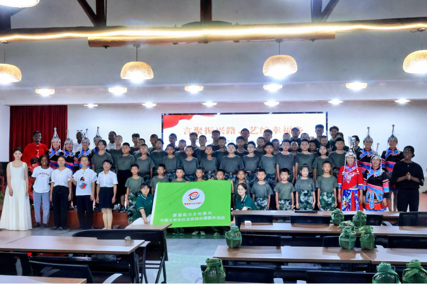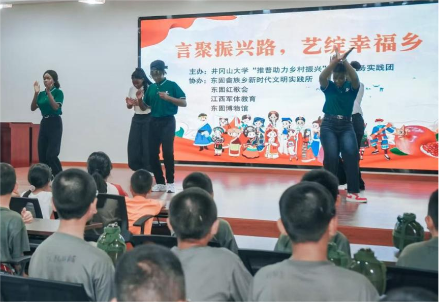实践团积极搭建多元文化交流平台,主办的“言聚振兴路,艺绽幸福乡”主题晚会将实践活动推向高潮。晚会成为一场生动诠释“美美与共,天下大同”的民族团结盛宴:喀麦隆留学生深情独唱中文歌曲《情歌》,津巴布韦留学生用普通话饱含深情地朗诵革命经典《可爱的中国》,展现了推普行动的跨文化魅力;东固少年激昂朗诵《未来在我们手中》,用童声普通话传递建设家乡的坚定信念。中外学子、畲汉群众、本地红歌会同台献艺,普通话成为联结情感、促进交融的坚实纽带。乡新时代文明实践所负责人高度评价晚会是“推广国家通用语言文字与促进民族交往交流交融的创新实践”。