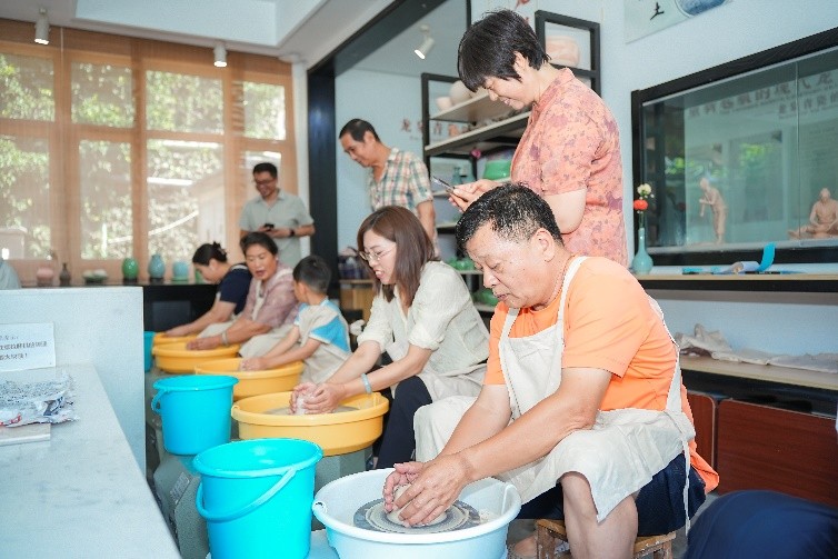 随后,由博物馆的工作人员带领客户参观、讲解馆内的藏品,通过馆内收藏的各类陶瓷的历史背景及发展史,了解龙泉青瓷千百年来的发展,体验非遗文化传承。客户们围坐于陶轮前,在专业导师的引领下,屏息凝神,尝试驾驭这旋转的陶土,开启一场沉浸式的“青瓷主人杯DIY手作活动”。他们指尖沾满湿润的陶泥,神情专注而宁静。通过揉泥、拉坯、修坯,体验龙泉青瓷独特的拉坯手法及制作过程,为自己量身定制属于自己的主人杯。