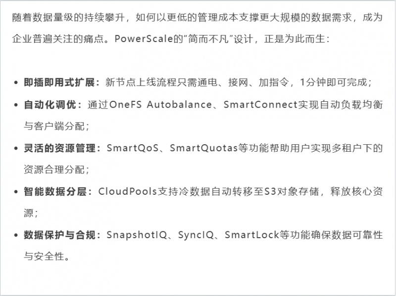 PowerScale集这些企业级功能于一身,不仅实现了性能领先,更在易用性、自动化与经济性上为平台运维提供更轻松的体验。