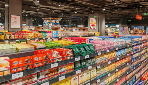 购物环境方面,曲江龙湖店取消了强制动线设计,赋予顾客更自由灵活的购物路径。尤为显著的是对货架布局的优化,中岛货架高度统一由原来的2-2.4米降至1.6米,层数精简至5-6层,整个卖场视野豁然开朗,商品陈列更加清晰易取。