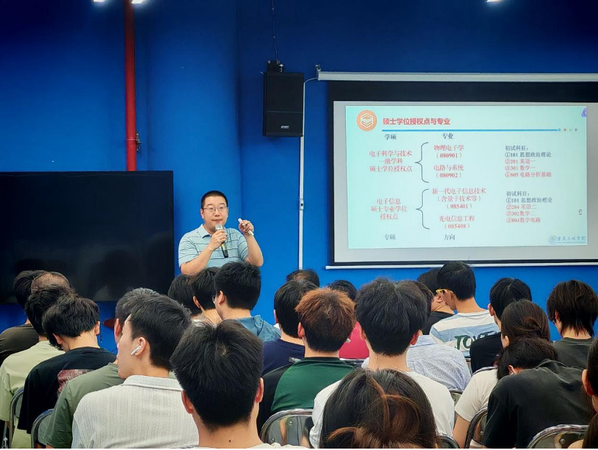 活动伊始,魏勇教授对近年通信与电子信息类专业考研政策变化进行解读,指出“专硕扩招、学硕缩招”的显著趋势,并结合教育部最新数据,详细分析了当前的竞争态势。他强调,考生需密切关注目标院校招生目录调整。针对跨地区考研,魏勇教授对比成渝、长三角等区域院校的学科特色与资源优势,建议同学们结合地域产业布局选择研究方向。他还阐述考研对学术深造与职业发展的意义,鼓励同学们以坚定信念和科学方法备考,提醒同学们吃透政策,根据政策调整自身的报考策略,实现精准报考。