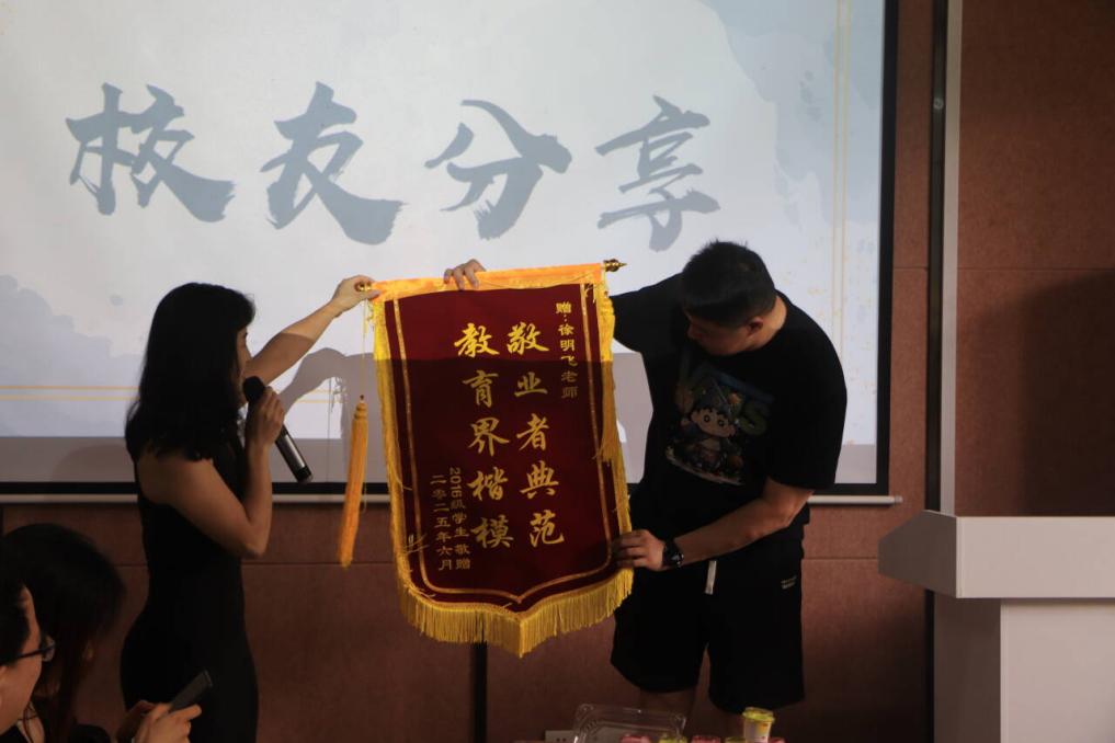 座谈会气氛在校友分享环节达到温馨高潮。2016级校友邱玉环手捧书有“敬业者典范,教育者楷模”的锦旗,郑重献给徐明飞老师。回忆起八年来的师生情缘,邱玉环校友声音略带颤抖:“正是在‘四位一体双院制’下,我收获了成长的幸福。最关键的是,正因为当年徐老师坚定的鼓励和毫无保留的支持,才能指引我在行业中前行,有了今天的发展。”校友乔骄阳以“不断尝试,在变化中寻找机遇”为主题,结合自身从转行成长的经历,分享了在就业压力大的环境下,如何保持核心竞争力的经验。此次校友分享不仅为同学们提供了职业规划与人生选择的宝贵经验,更展现了校友心系母校、回馈社会的情怀,为在校学生树立了榜样。