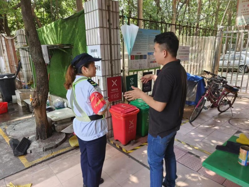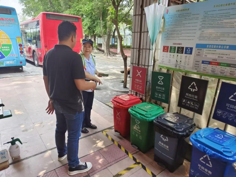 活动现场,市政所的工作人员在公交站旁设置了宣传展位,摆放了多个颜色鲜明的分类垃圾桶模型,并张贴了垃圾分类指南海报。同时,工作人员走到投放点旁边,向过往市民发放垃圾分类宣传手册,现场讲解垃圾分类的重要性和具体操作方法。