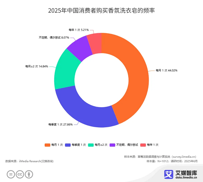 从购买频率来看,消费者对于香氛洗衣皂的需求也呈现出一定的规律性。根据2025年的数据,每月购买1次的消费者占比最高,达到44.02%;每季度购买1次的消费者占比为27.86%;每月购买≥2次的消费者占比为14.84%;此外,还有8.07%的消费者表示会不定期、偶尔尝试购买香氛洗衣皂。这表明香氛洗衣皂已经逐渐成为消费者日常生活中的常用品,且购买频率较高。