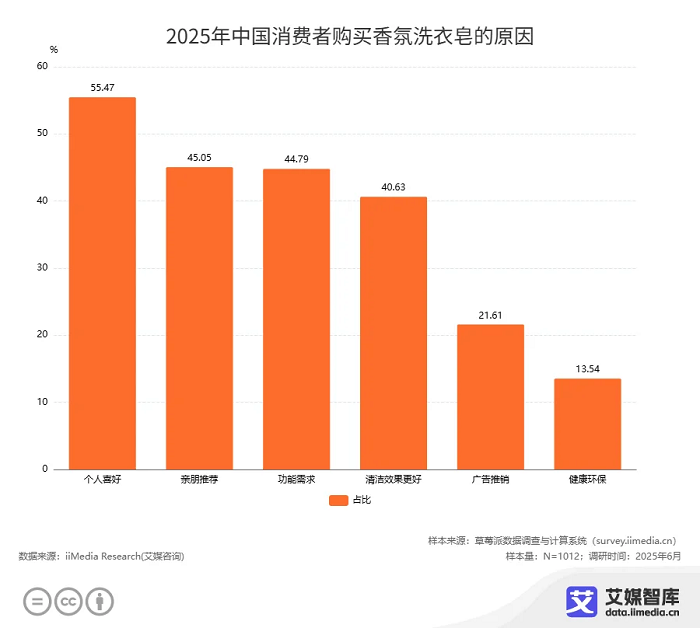 在当今消费升级的时代,消费者对于生活品质的追求不断提升,这在日常生活的方方面面都得到了体现。洗衣皂作为家庭清洁的必备用品,早已不再局限于单一的清洁功能。2025年,中国消费者购买香氛洗衣皂的原因呈现出多样化的特点,其中个人喜好占比最高,达到55.47%。这表明消费者对于香氛洗衣皂的喜爱不仅仅是因为其清洁效果,更在于其带来的愉悦体验。此外,亲朋推荐(45.05%)、功能需求(44.79%)以及清洁效果更好(40.63%)也是消费者选择香氛洗衣皂的重要因素。