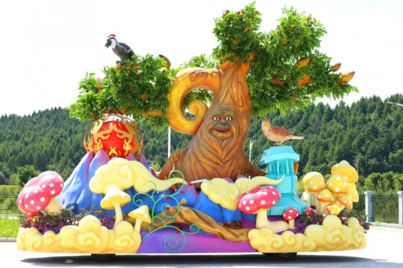 “钟林毓秀花车”,生动展现了伊春“中国林都”的绿色魅力。中央挺拔的红松仙树象征着伊春持续开展的植树造林工程,树上栖息的啄木鸟、红隼与树下生长的蓝莓、五味子,共同勾勒出生物多样性的和谐画卷。金祖峰日出云海的壮美景观与八面乐舞石幢的神秘韵味,诉说着伊春生态保护的丰硕成果。花车通过森林生态系统的完整呈现,既彰显了伊春的生态发展理念,又传递出植树造林、守护生态的永恒主题,展现了一座城市与自然共生共荣的生态文明实践。