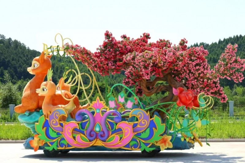 “鹿逐花梦花车”,巧妙融合了小兴安岭独特的自然景观与生物多样性。车头三只灵动的小鹿象征着伊春“中国鹿乡”的美誉,与九峰山、金山鹿苑等标志性景观交相辉映。盛开的杜鹃、百合和冰凌花点缀其间,展现伊春四季分明的生态特色。花车通过森林古树与野生动物的和谐共生场景,生动诠释了伊春“生态立市”的发展理念,既彰显了“中国林都”丰富的自然资源,又传递出人与自然和谐共处的文明思想,让观众在梦幻的森林之旅中感受生态保护的深远意义。
