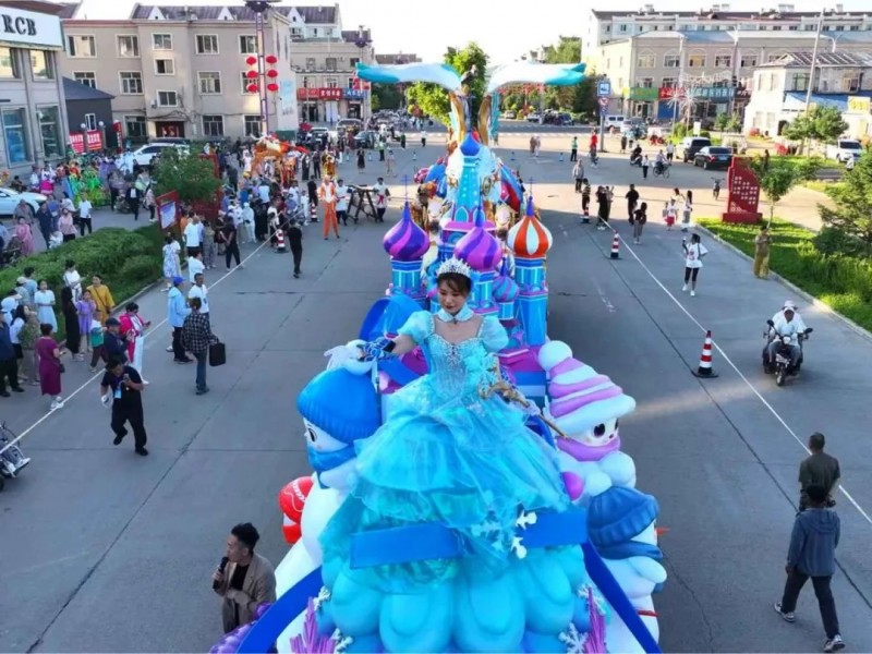 巡游队伍中,47名专业演员的表演同样精彩纷呈。“金翎飞霄”方阵的男演员们身着女真武士铠甲,手持长矛跳起刚劲有力的战舞;“钟林毓秀”方阵的女演员则化身森林精灵,轻盈的舞步配合着花车上摇曳的蓝莓枝桠,演绎出林间仙境的唯美画面。演员们还不时走下花车与观众互动,教小朋友模仿鄂伦春族的传统舞蹈动作,现场笑声不断。